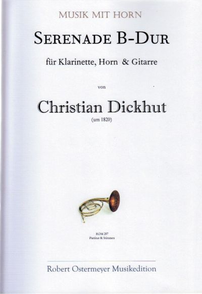 Dickhuts 1.Serenade nutzt schon seine neue Erfindung, eine Aufführung auf dem Naturhorn wird damit zum Problem, da Töne genutzt werden, welche durch die Stopftechnik des Naturhorns nur schwer zu spielen sind, durch Dickhuts Erfindung jedoch sauber intoniert werden konnten. Dickhuts Trio op. 6 wurde etwa 1815 beim Mannheimer Verlag Charles F. Heckel mit der Plattennummer 30 gedruckt. Als letztes und umfangreichstes Werk Dickhuts erschien beim selben Verlag mit der Plattennummer 283 seine Serenade B-Dur für Klarinette, Horn und Gitarre.