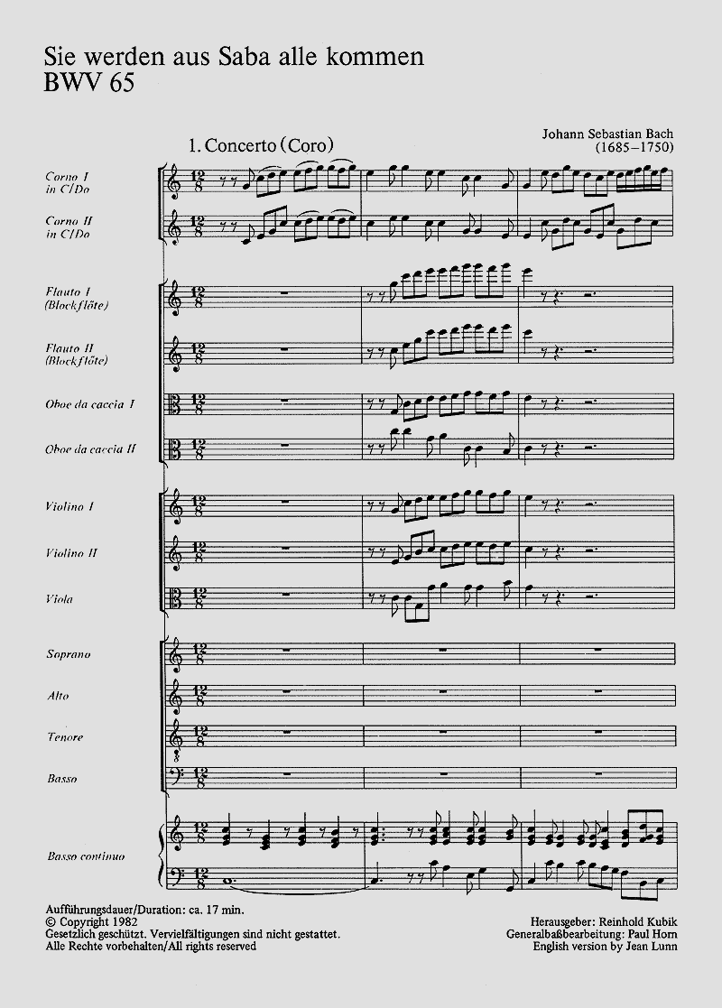- Besetzung Soli, Gemischter Chor (SATB), 2 Hörner, 2 Blockflöten, 2 Oboen, Streicher und Orgel