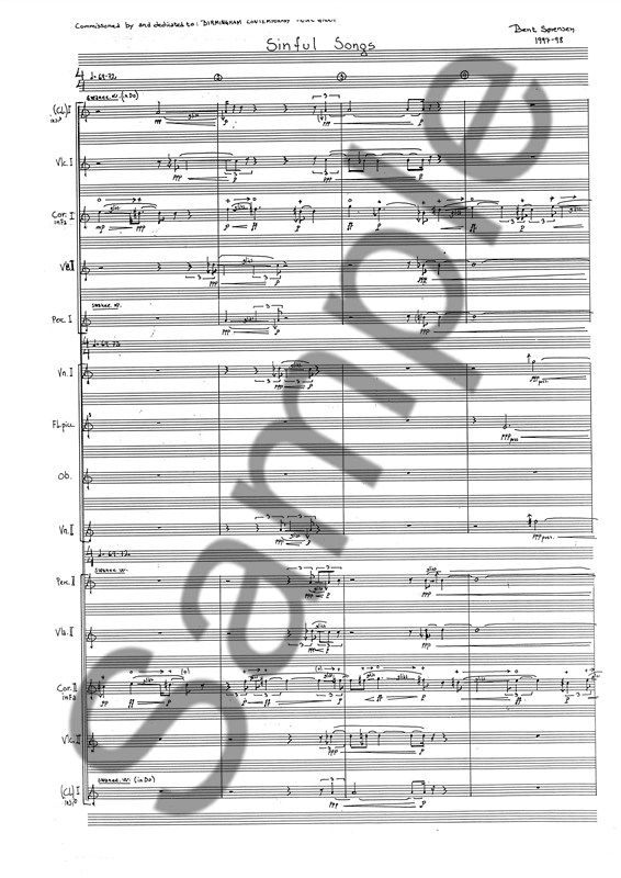 The first ideas for this piece came to me during a train journey through Denmark. It was summer and I was looking out of the window; I heard some fast jig-like dance rhythms. These appear early in the work - hushed and hidden like almost all the music, apart from the roaring horns in the beginning! As is always the case for me, the title was there at once - and as always it is difficult for me to explain it! The work is filled with little songs and fragments of melodies - some of them distinct, most of them hidden - but whether they have ended up becoming particularly sinful, I don't know. The musicians are positioned in a circle around the audience, so the music will not sound the same at any two different points in the hall. The music moves at varying speeds both around the circle, and backwards and forwards between different instrumental groupings. SINFUL SONGS was commissioned by and dedicated to the Birmingham Contemporary Music Group.