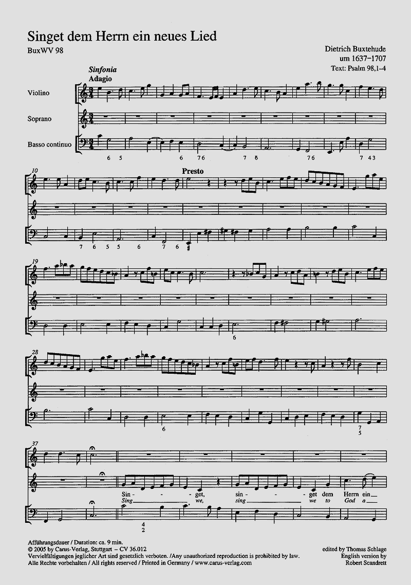 Kantate - Buxtehudes zahlreiche für die Aufführung in der Lübecker Marienkirche geschriebenen Vokalkompositionen sind stilistisch sehr unterschiedlich gehalten. Die Kantate 'Singet dem Herrn ein neues Lied' über die ersten Verse des Psalms 98 stellt wegen der Verwendung nur eines Soloinstruments sogar ein Unikat im Schaffen Buxtehudes dar. Die im konzertanten Stil gehaltene Komposition bietet beiden Solisten dankbare Aufgaben. - Solo S, Vl, Bc