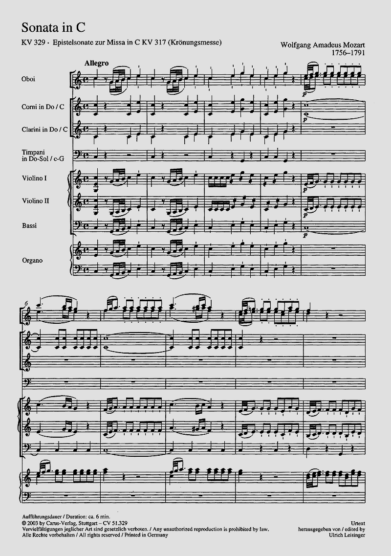 Epistelsonate - Das Autograph der Epistelsonate wurde im Mozartjahr 1991 von der Staatsbibliothek zu Berlin, Preussischer Kulturbesitz, erworben. Die kritische Neuausgabe von Ulrich Leisinger ist die erste Ausgabe, die sich darauf stützen kann. 2 Ob, 2 Cor, 2 Ctr, Timp, 2 Vl, Org o Vc/Cb