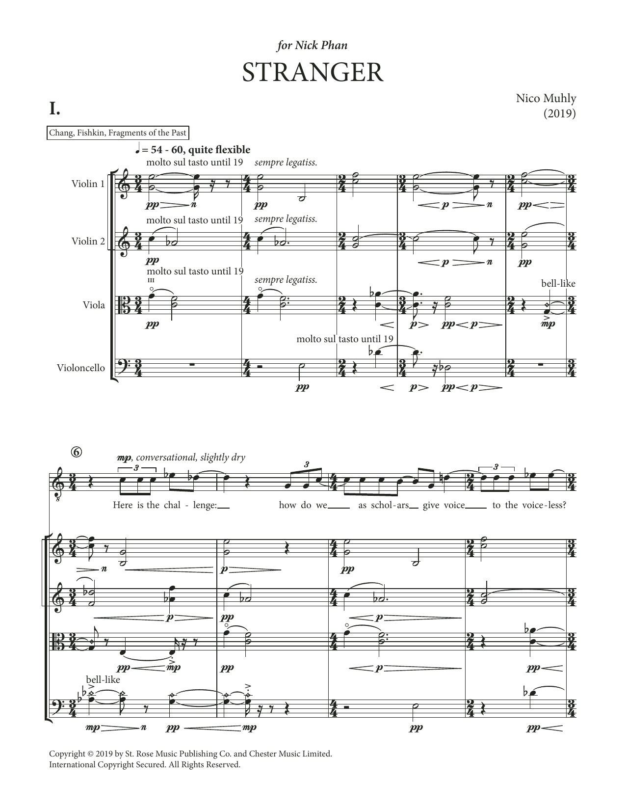 Scored for Tenor and String Quartet, Stranger was commissioned by the Philadelphia Chamber Music Society with support from the Pew Center for Arts & Heritage. The World Premiere was given by Nick Phan (tenor) and Brooklyn Rider at the Perelman Theater, Kimmel Center, Philadelphia on January 24, 2020. Parts available: SRO100197-01