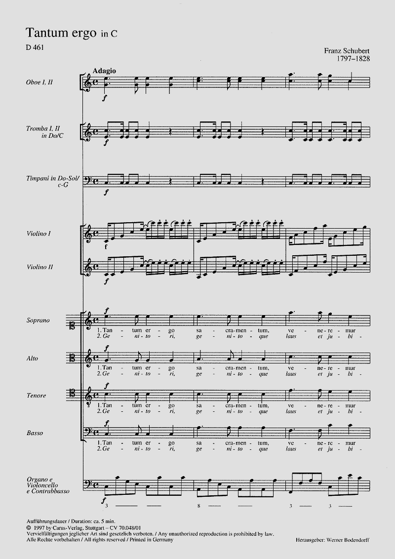 Soli SATB, Coro SATB, 2 Ob, 2 Tr, Timp, 2 Vl, Vc/Cb, Org