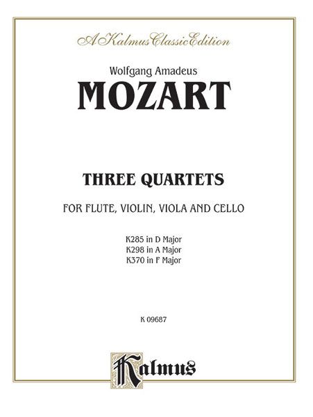 A collection of three quartets for Flute, Violin, Viola, and Cello, expertly composed by Wolfgand Amadeus Mozart.