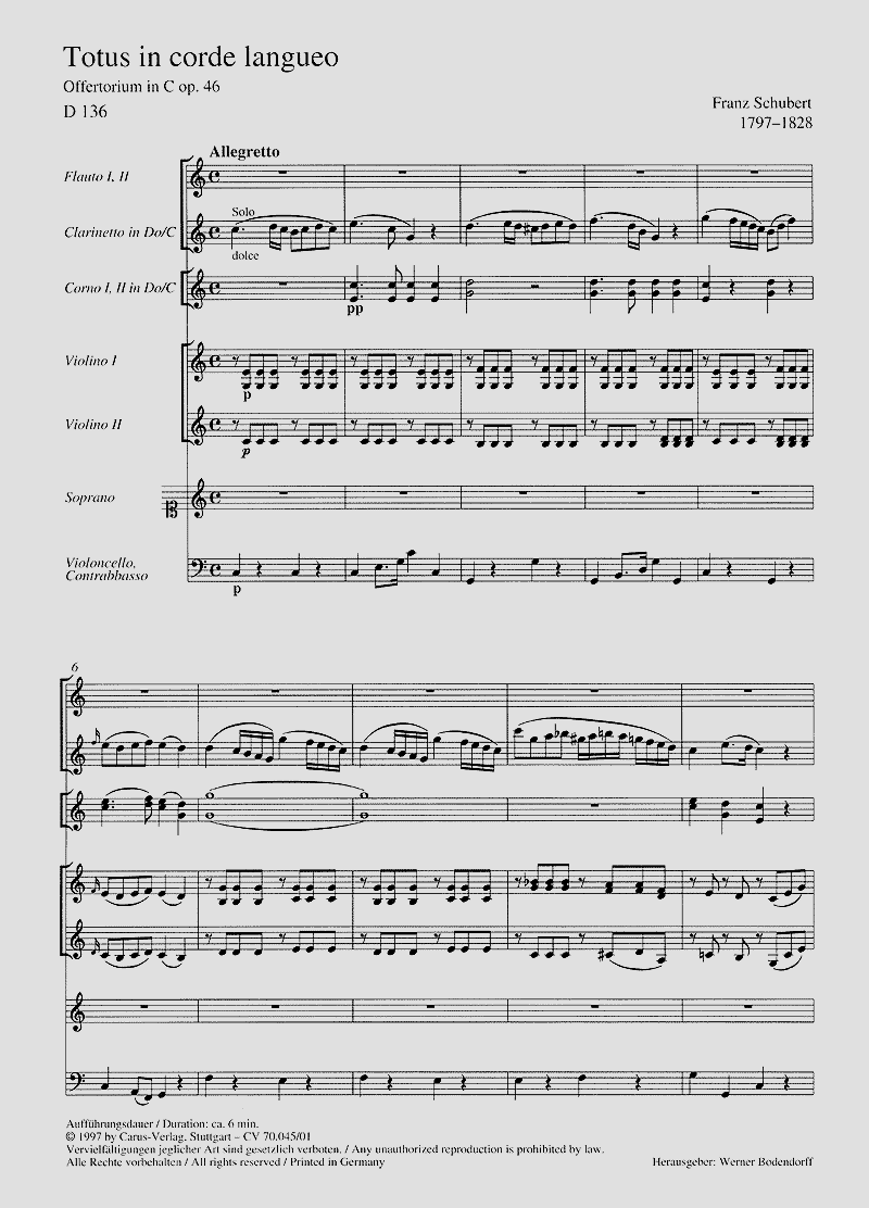- Besetzung Gesang (hoch), Klarinette, 2 Querflöten, 2 Hörner, Streicher und Orgel