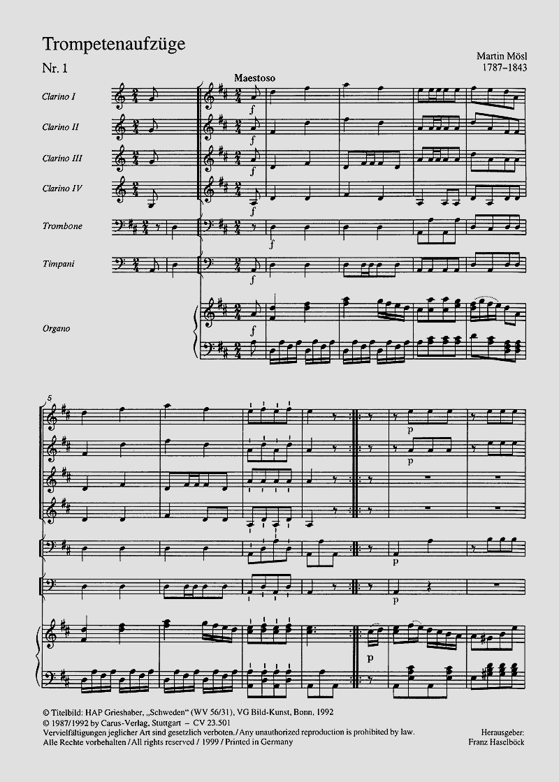 - Besetzung 4 Trompeten, 2 Hörner, Posaune, Pauke und Orgel