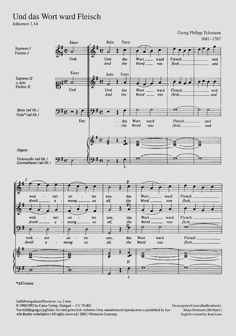 - Besetzung Chor (2-stimmig), 2 Violinen und Basso Continuo