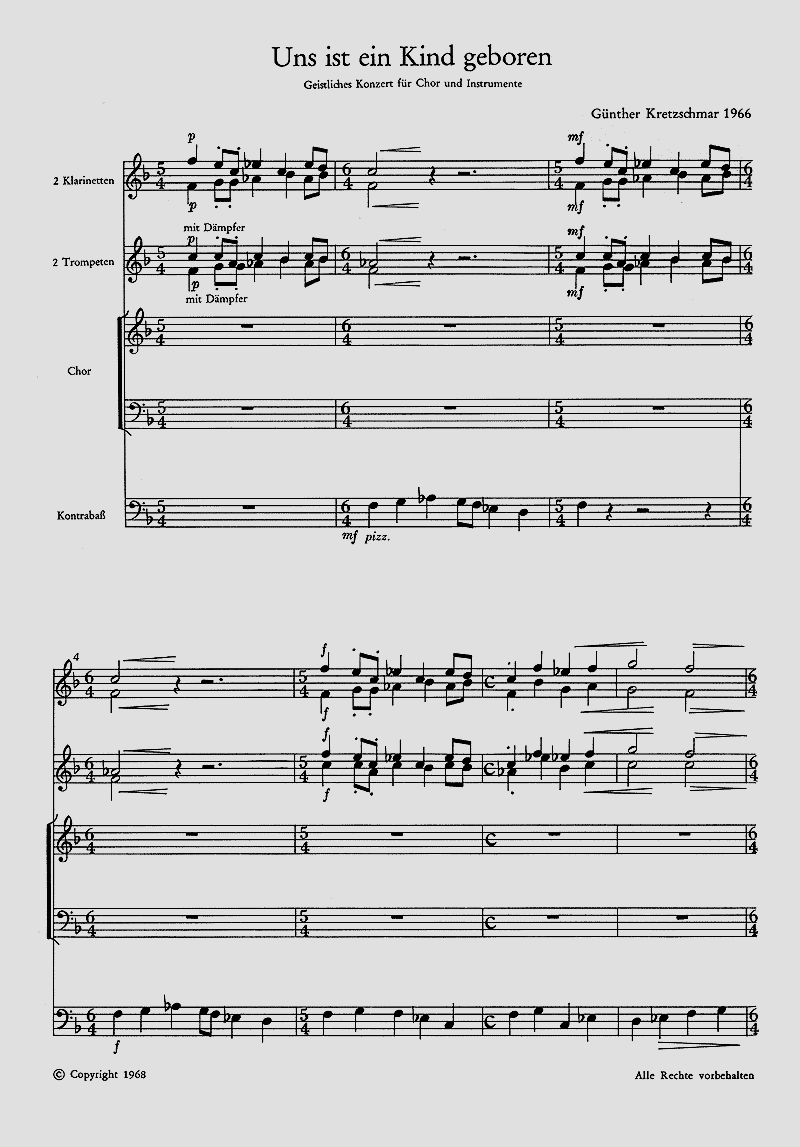 - Besetzung Gemischter Chor (SATB), 2 Klarinetten, 2 Trompeten und Kontrabass