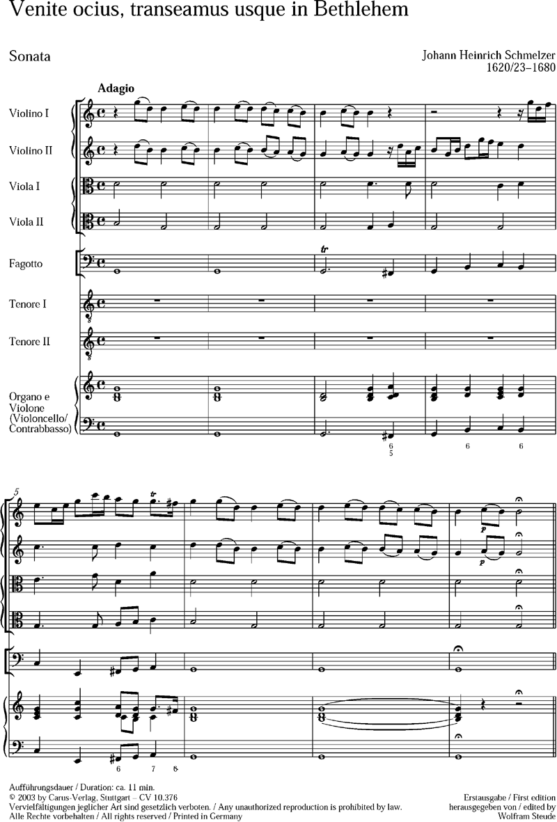 Weihnachtskantate - Mit dieser pastoral getönten Weihnachtskantate von Johann Heinrich Schmelzer, dem langjährigen Wiener Kaiserlichen Hofkapellmeister, soll auf einen prominenten Barockkomponisten hingewiesen werden, der mit seinen Vokal- und Instrumentalwerken in der 'Alte-Musik-Szene' noch längst nicht den Platz erhalten hat, der ihm kompositionsgeschichtlich zukommt. Schmelzers leicht aufführbare lateinische Hirtenmusik präsentiert sich in teils schlichter, von alpinen Idiomen geprägter Melodik, teils im Stil der festlichen venezianischen Barockoper. Fünf- bis siebenstimmige Partien wechseln mit generalbassbegleiteter Ein- oder Zweistimmigkeit ab. Soli TT, 2 Vl, 2 Va, Fg, Bc