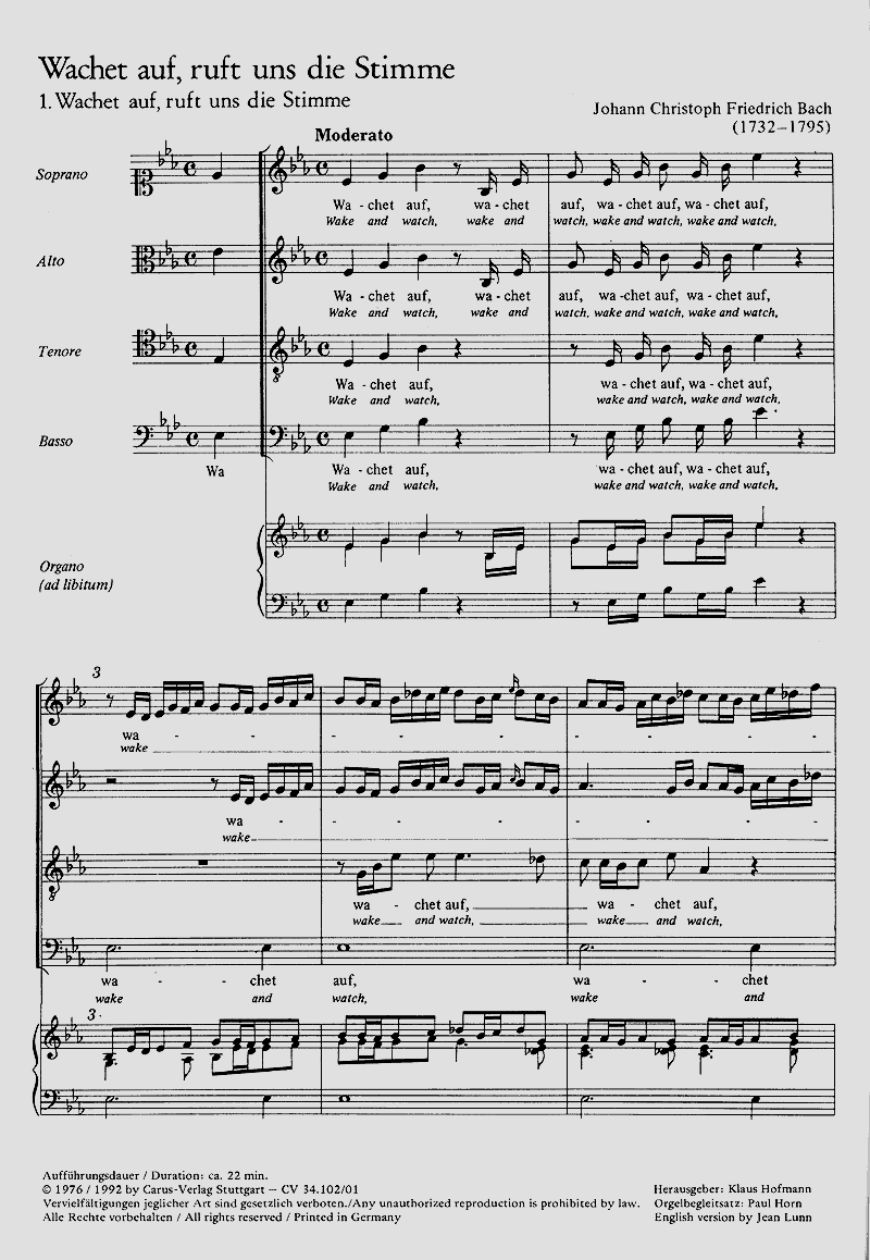 Johann Christoph Friedrich Bach greift in seiner Motette 'Wachet auf, ruft uns die Stimme' in einem 'Choral' überschriebenen Teil auf einen Kantionalsatz aus der Feder seines Vaters zurück. Es handelt sich um den Schlusschoral von Johann Sebastian Bachs gleichnamiger Kantate BWV 140. - Coro SATB, [4 Instr, Org]