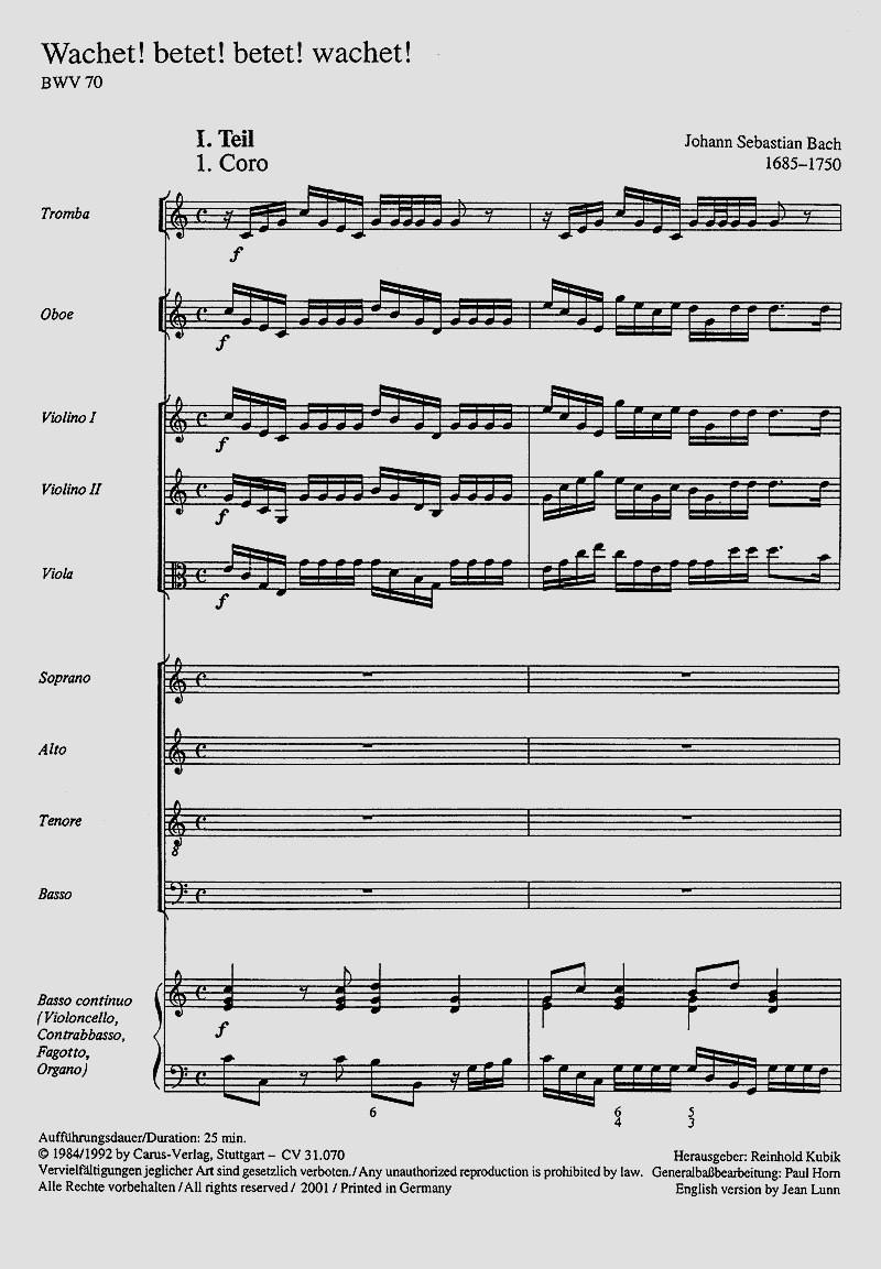Kantate zum 26. Sonntag nach Trinitatis - Umarbeitung einer Adventskantate aus dem Jahr 1716 (BWV 70a; heute verschollen). Soli SATB, Coro SATB, Tr, Ob, Str, Org