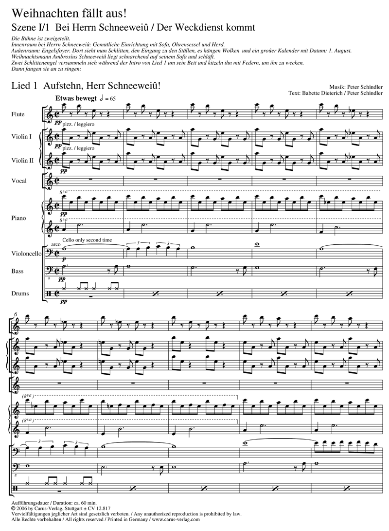 Ein Musical zur Weihnachtszeit - Der Klavierauszug ist gleichzeitig die Klavierfassung. Deutscher Musikeditionspreis 2007. Fassung 1: Soli, 1-2stg Kinderchor, Fl, 2 Vl, Vc, Cb, Pfte, Perc, [Git]; Fassung 2: Soli, 1-2stg Kinderchor, Pfte (Bass, Git; Perc ad lib).
