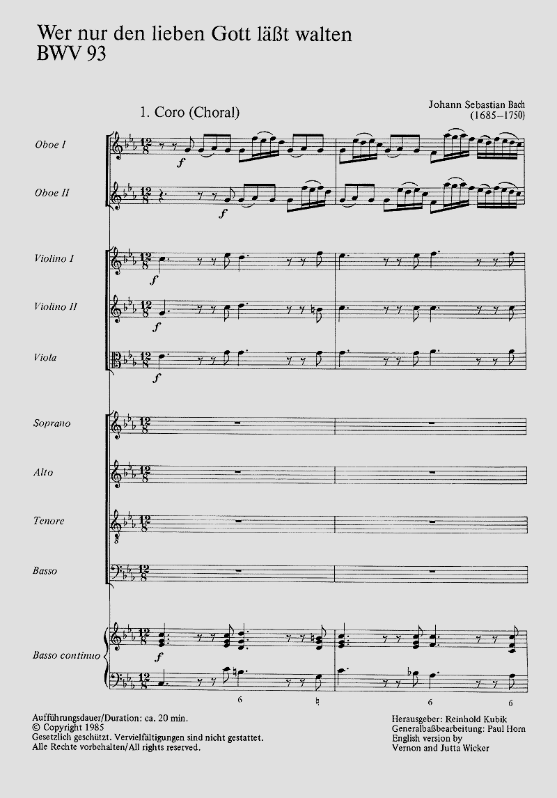 Kantate zum 5. Sonntag nach Trinitatis - Für diese Choralkantate übernahm Bach die 1, 4 und 7 Strophe des gleichnamigen Chorals von Georg Neumark. Die anderen Strophen sind dagegen mit freien Nachdichtungen vermischt worden. Soli SATB, Coro SATB, 2 Ob, Str, Org