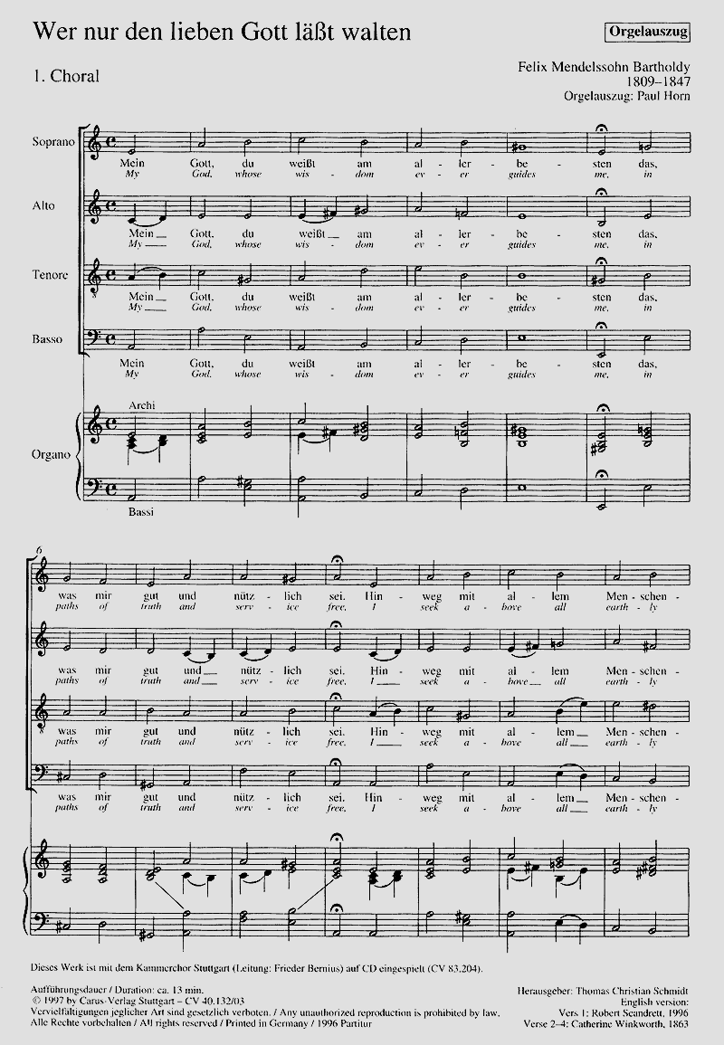 Choralkantate - Schon während Mendelssohns Lehrjahren bei Zelter hatte die Bearbeitung von Chorälen eine große Rolle gespielt, und die Beschäftigung mit dem evangelischen Choral zieht sich sogar durch sein sinfonisches und oratorisches Schaffen. Die im Zusammenhang mit der Wiederaufführung der Matthäuspassion besonders intensive Auseinandersetzung mit dem Werk Bachs führte zu einer Reihe von Kantaten über bekannte Choralweisen für Chor, Instrumente und manchmal auch Soli. Nicht nur für Kantatengottesdienste stellen sie eine große Bereicherung dar. Solo S, Coro SATB, 2 Vl, Va,Vc/Cb