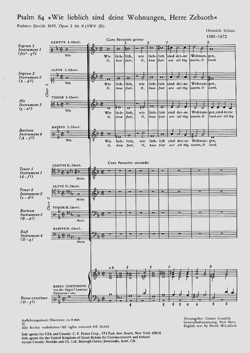 Nachdem Schütz nach dem Tode Gabrielis von seinem Aufenthalt in Venedig in seine Heimat zurückkehrte, begann er die erworbenen Eindrücke musikalisch zu verarbeiten. Vor allem das mehrchörige Musizieren war hierbei sehr wichtig, wofür die zwischen 1615 und 1619 entstandenen Psalmen Davids ein Beleg sind. - Fav SSABar/TTBarB, Cb, Org, [8 Instr] - Partitur (ohne Umschlag) - Tonart dorisch