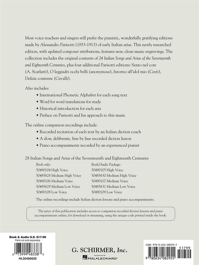 Most voice teachers and singers still prefer the pianistic, wonderfully gratifying arrangements of this early Italian material made by Alessandro Parisotti in the 1880s. This new edition, newly researched and engraved, includes the original Schirmer 24 plus four additional songs: Sento nel core (A. Scarlatti), O leggiadri occhi belli (anonymous), Intorno all'idol mio (Cesti), Delizie contente, che l'alma beate (Cavalli). With IPA, word for word translations, and historical information on each song and composer. The CD includes piano accompaniments and recorded pronunciation lessons.