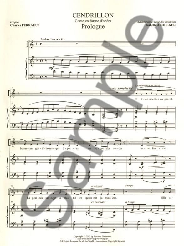 Cinderella is an opera-story created by Isabelle Aboulker in French and based on a story by Charles Perrault. Featuring the scores for Voice and Piano, this piece requires different voices to sing the characters'' parts (including3 sopraninos) and an actor for the story-telling. The Piano part can be played easily by a professional player. This piece was recorded for audio-books, had representation for children in Paris theatre and is generally reallyenjoyed by the audience. Isabelle Aboulker is a French composer specially known for her opera, her vocal works, and for her adaptations of stories and fables.