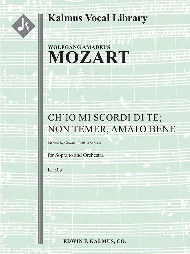 Die große Konzertarie CH'IO MI SCORDI DI TE? ... NON TEMER, AMATO BENE (WILL I FORGET YOU/ ... FEAR NOT, BELOVED), KV 505, wurde von Wolfgang Amadeus Mozart (1756-1791) im Dezember 1786 in Wien geschrieben. Zuvor hatte Mozart auf der Grundlage desselben Textes von Giovanni Battista Varesco eine Einschubarie (KV 490) für eine revidierte Fassung seiner Oper IDOMENEO aus dem Jahr 1781 geschrieben, die privat im Palais des Fürsten Auersperg aufgeführt werden sollte. Die Arie war in diesem Fall für die Rolle des Idamante als Tenorstimme gedacht. In KV 505 ist derselbe Text für Sopran gesetzt, und es wurde speziell für Nancy Storace geschrieben, wahrscheinlich für ihr Abschiedskonzert, das am 23. Februar 1787 im Theater am Kärntnertor stattfand. Das Werk besteht aus zwei Teilen: 1. CH'IO MI SCORDI DI TE? (Rezitativ), und 2. NON TEMER, AMATO BENE (Arie). Instrumentierung: 0.0.2.2: 2.0.0.0: Pno im Satz: Str (4-4-3-3-3 im Satz): Solo [Sopran].