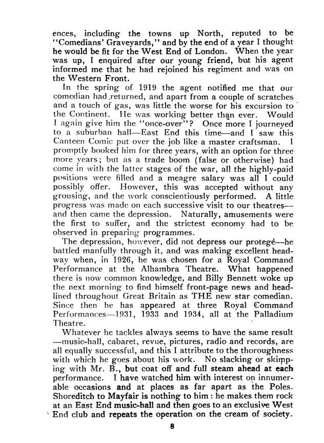 Billy Bennett (1887-1942) was a British comedian who specialised in comic monologues. He was born into the music hall industry and, after a decorated spell in the Army during the First World War, he began his ownsuccessful stage career in 1919. Often billed as Almost a Gentleman, he shot to fame at the 1926 Royal Command Performance (now the Royal Variety Shows), and remained a popular public figure for over a decade.