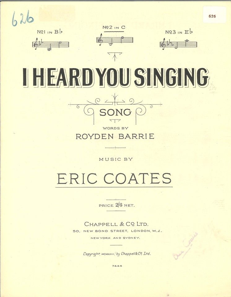 I Heard You Singing, written by Eric Coates with words by Royden Barrie, arranged for voice and piano in the key of C Major.
