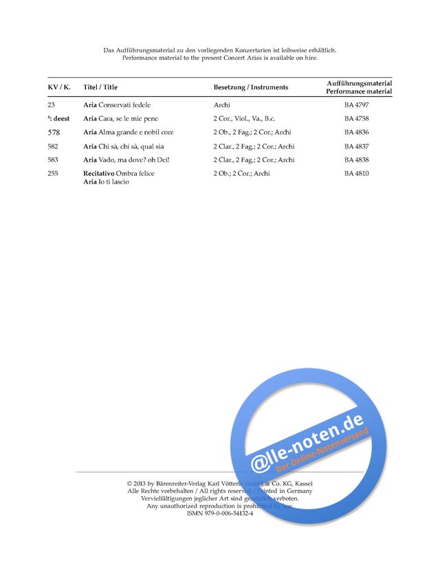 Dieser Klavierauszug der Konzert- und Einlagearien Mozarts beruht auf dem Notentext der 'Neuen Mozart-Ausgabe' (NMA). Im Unterschied zur NMA ist der Notentext selbst frei von aufführungspraktischen Hinweisen und Ausführungsvorschlägen.