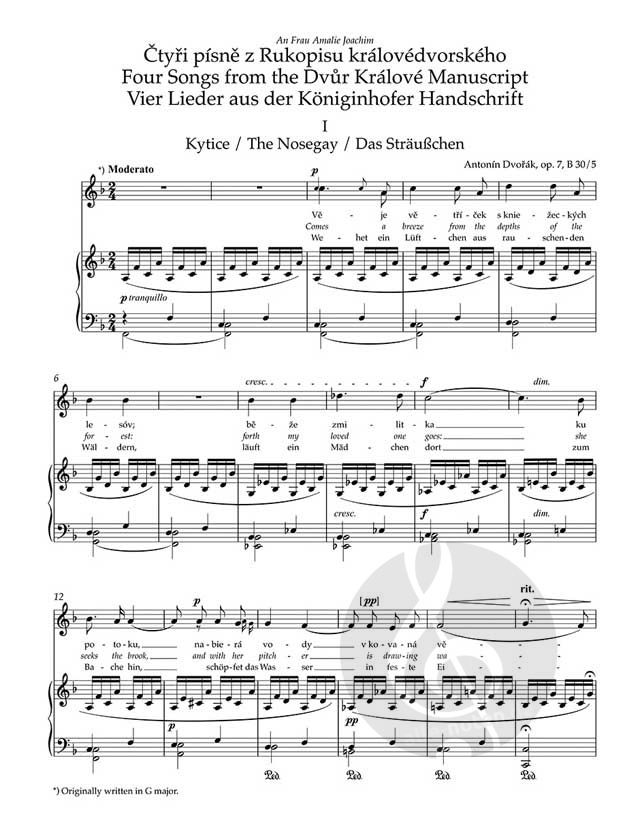 Häufig bleiben sowohl die genaue Entstehungszeit der Lieder als auch ihre Originalsprache unklar – einige Lieder sind ausschließlich mit deutschen Gesangstexten erhalten. Auch vor diesem Hintergrund hat sich der Herausgeber für eine Aufteilung seiner Edition in zwei Teile entschieden: Auf die 24 Lieder, die Dvorák zu Lebzeiten im Druck veröffentlichte, folgen sieben weitere, die nur handschriftlich überliefert sind. Die Anordnung weicht damit bewusst vom Burghauser-Werkverzeichnis ab und orientiert sich an der Präsentation, die Dvorák selbst im Austausch mit seinen Verlegern festgelegt hat.