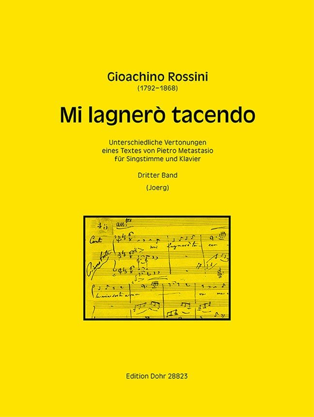 [Motto] Girolamo Crescentini (1762-1846): Mi lagnerò tacendo. Arietta (vor 1806). Erstausgabe[11] Nizza - Canzonetta (um 1835). Moderne Erstausgabe[11a] Nizza (deutsche Textfassung)[11b] Nizza (deutsche Textfassung)[11c] Mi lagnerò tacendo (Rekonstruktion)[12] Mi lagnerò tacendo (Februar 1835). Moderne Erstausgabe[13] Mi lagnerò tacendo (26. Mai 1845). Erstausgabe[14] Adieux à la via! - Elégie (sur une seule note) (vor 1864). Neuausgabe[14a] Mi lagnerò tacendo (sopra una sola nota) (Variante; vor 1864). NeuausgabeANHANG[2a] Sorzico (Variante; 27. Juli 1856). Erstausgabe[6b] La partenza (vor 1816). Moderne Erstausgabe[6c] La partenza (Variante mit Klavierbegleitung von Carlo Michelangelo Sola; zwischen 1816 und 1821?). Moderne ErstausgabeDer Band enthält ein ausführliches Nachwort nebst kritischem Bericht.