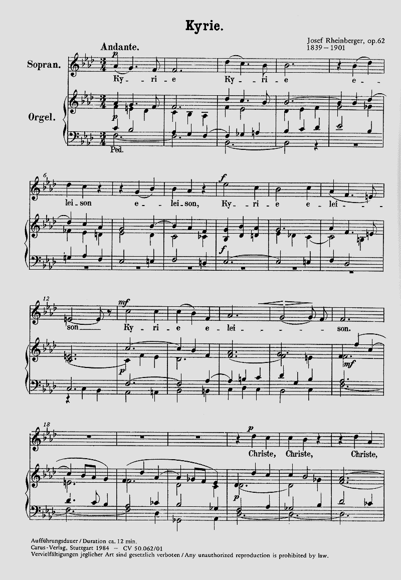 Missa puerorum (Kleiner und leichter Messgesang) - Josef Rheinberger hat 18 Messen hinterlassen. Davon sind 5 a-cappella-Werke, 9 werden von der Orgel und 4 von mehreren Instrumenten begleitet. Unter den von der Orgel begleiteten Werken haben die 'leicht ausführbaren' ihren eigenen Rang. Vom Komponisten selbst als reine Gebrauchsmusik gewertet, erfreuten sie sich schon zu seinen Lebzeiten einer gro-en Beliebtheit. Zu den Werken, die bald zum festen Repertoire kleiner Kirchenchöre gehörten, zählt auch der 'Kleine und leichte Messgesang'.