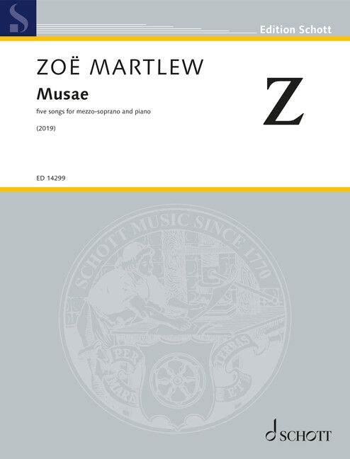 Mit der Idee der griechischen Musen als Ausgangspunkt ist Musae ein zeitgenössisches Spiegelbild verschiedener Aspekte der Frau, in all ihrer Kraft, Verletzlichkeit, Unordnung, Schönheit, Weisheit und grenzenlosen Fähigkeit zu lieben. Wir begleiten eine Ehefrau, die am Rand ihrer Ehe am Ende ihrer Ehe steht, an einem Esstisch, von ihrem ehebrecher, ahnungslosen, laut Steak essenden Ehemann über die Kante getrieben, aber nicht in der Lage zu gehen. Dann treibt sie in die rot beleuchtete Welt einer Prostituierten, ihre schwebende Identität geht im sinnlichen Rauch verloren; Wir erleben die panische Sorge eines sich selbst verletzenden Teenagers über einen wenig schmeichelhaften Beitrag in den sozialen Medien; und Segnungen von einer Hohepriesterin und einem sehnsüchtigen Liebhaber zu empfangen. Jedes Lied ist stark gefärbt in einem völlig anderen Musikstil, mit Anspielungen auf das Weimarer Kabarett, üppige französische Harmonie, 90er-Jahre-Pop, straffe kanonische Formen, rauchigen Jazz, die Romantik des späten 19. Jahrhunderts – und auch nichts davon. Musae wurde von Wild Plum Arts mit Unterstützung der Vaughan Williams Foundation, des Hinrichsen Trust und der Großzügigkeit der Wild Plum-Spender beauftragt. Uraufführung von Lucy Schaufer (Mezzosopran) und Huw Watkins (Klavier) beim Cheltenham Music Festival im Juli 2019 im "Composium" im Rahmen von WPAs "All About the Women". Zoë Martlew