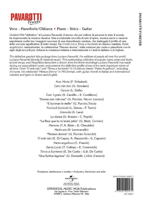 The definitive greatest hits recorded by Luciano Pavarotti. An outstanding collection of 18 popular opera arias, sacred songs, and Neapolitan favorites. Includes: Funiculì funicul - Nessun dorma - O sole mio - Santa Lucia - andmore!