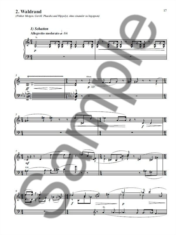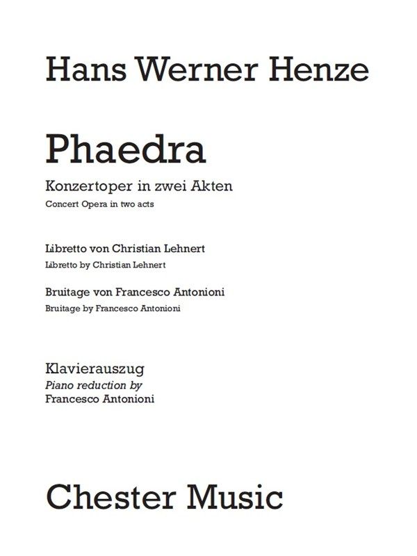 Phaedra by German composer Hans Werner Henze is a 'concert opera' in two acts whose first performance was given at the Berlin State Opera in 2007. Phaedra was Henze's penultimate opera, and this item presents the vocal score, with the entire work lasting around 75 minutes. The parts are for Mezzo-Soprano, Soprano, Tenor, Countertenor, Bass Baritone, as well as a mime.