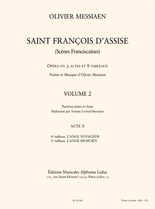 Saint Francis of Assisi is an opera in 3 acts by Olivier Messiaen. This volume is focused on the Act II - 4. L'ange voyageur & 5. L'ange musicien which depict the appearance of Angels to Saint Francis. Based on the life of SaintFrancis of Assisi, this opera is set in Italy and is composed as per below: Act I: 1. La croix 2. Les laudes 3. Le baiser au lépreux Act II 4. L'ange voyageur 5. L'ange musicien 6. Le prêche aux oiseaux Act II 7. Lesstigmates 8. La mort et la nouvelle vie This opera was played at the Paris Opera in 1983. Olivier Messiaen (1908-1992) was a French organist and composer who was passionate about Ornithology and one of the most importantcomposers of his century. Inspired by Japanese music, he had a very special way of composing and his work can be identified by its complexity, its diatonic aspect, its harmony with limited transposition, its colour and itsadditive rhythms. He composed many works related to ornithology and birdsong, including the 'Bird Catalogue' in 7 volumes and the 'Treatise on rhythm, colour and ornithology' in 7 volumes.