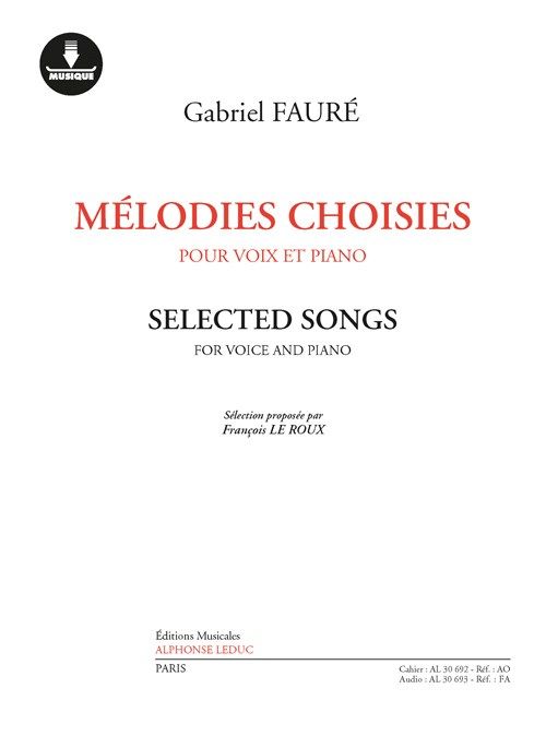 Widely acclaimed by music lovers for over a century, Selected Songs  -of Gabriel Fauré (1845-1924) are here collected into an anthology, complete with an audio version in the form of a download card. Excerpted from the 1stcollection published in 1879, Au bord de l'eau and Ici bas bestow an aura of internal reverie on Sully Prudhomme's simple poems, made palpËable by the harmonic refinement and vocal fluidity that constitutes the very essence ofFaurean charm.   -Several vocal pages selected in the 2nd volume (1897) continue to be favourites: Les Roses d'Ispahan restored to their dreamy stillness, Les Berceaux whose oscillation evokes the swaying of boats, and the verynostalgic Clair de lune in which Verlaine's words, set to music for the first time, inspired Fauré to write what would become one of his masterpieces: La Bonne Chanson.   -From this cycle, drunk on lovelorn lyricism, thecollection retains Puisque l'aube grandit, an exalted melody if there ever was one, and La lune blanche luit dans les bois, a nocturnal landscape in F sharp major ' two pearls that distil the same mystery of solace.