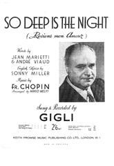 So Deep Is The Night (Reviens Mon Amour), music composed by Frederic Chopin, arranged by Mario Melfi, with original words by Jean Marietti and Andre Viaud, with English lyrics by Sonny Miller, as sung and recorded by Gigli, arranged for voice and piano.