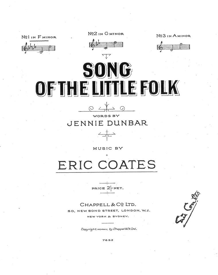 Song Of The Little Folk, written by Eric Coates with words by Jennie Dunbar, arranged for voice and piano in the key of F Minor.