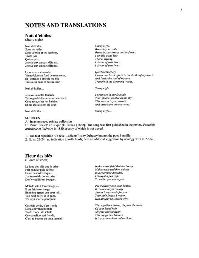A major new critical edition of important standard repertory with 61 songs in 2 volumes. All songs are presented only in the original key, with no transpositions. All the song cycles and groupings appear in one of the two volumes. Years in preparation, this edition is based on the most reliable sources available in the world, with most of the research centered at the Bibliotheque Nationale in Paris. Each song is presented with a line-by-line translation and full critical notes citing the research as it applies to specifics in the songs. Also includes a glossary of French terms. Contents: Nuit d'étoiles / Fleur des blés / Zéphyr / Aimons-nous et dormons / Jane / Pierrot / Rondeau / FEte galante / Beau soir / FEtes galantes pour Madame Vasnier (Pantomime; En sourdine; Mandoline; Clair de lune; Fantoches) / Apparition / Récti et Air de Lia / Ariettes oubliées (C'est l'extase langoureuse; Il pleure dans mon coeur; L'ombre des arbres; Chevaus de bois; Green; Spleen) / Cinq poèmes de Charles Baudelaire (Le balcon; Harmonie du soir; Le jet d'eau; Recueillement; La mort des amants) / Trois mélodies (La beele au bois dormant; Voici que le printemps; Paysage sentimental).