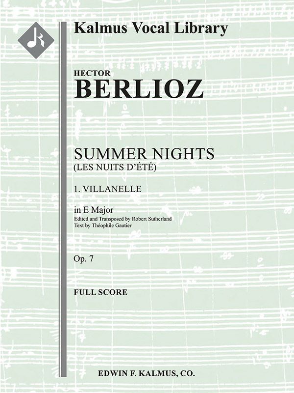 Der Liederzyklus LES NUITS D'ETE (SOMMERNÄCHTE) ist eine Vertonung von sechs Gedichten des Nachbarn und Freundes des Komponisten Hector Berlioz (1803-1869), Théophile Gautier. Der Text behandelt das Thema der Liebe in all ihren Facetten, von der jugendlichen Unschuld über den Verlust bis hin zur Erneuerung. Ursprünglich 1841 für Solosänger und Klavier komponiert, vollendete Berlioz 1856 die Orchestrierung aller sechs Lieder. Obwohl dieser Liederzyklus viele Jahre lang bedauerlicherweise vernachlässigt wurde, wurde er im 20. Jahrhundert wiederentdeckt und ist zu einem der beliebtesten Werke des Komponisten geworden. Die Lieder in den Originaltonarten (1. A; 2. B; 3. f-Moll; 4. fis; 5. D; 6. F) sind beim Verlag sowohl als Gesamtausgabe (A2573) als auch einzeln erhältlich. Robert Sutherland hat fünf der Lieder des Zyklus bearbeitet und jeweils in mehrere Tonarten transponiert, um das Werk für mehr Sängerinnen und Sänger zu erweitern. Von Robert Sutherland ergänzte Lieder: 1. Villanelle (E, F und G), 4. Absence (Db, D, Eb und E), 5. Au Cimetière, Clair de lune (Bb, B und C) und 6. L'lle inconnue (D, Es und E). Eine Transposition von 2. Le Spectre de la rose nach D und eine Transposition von 3. Sur les Lagunes nach g-Moll ist ebenfalls beim Verlag erhältlich. Villanelle feiert den Frühling und die Liebe und lädt die Geliebte ein, durch den Wald zu spazieren, Walderdbeeren zu pflücken und sich an den Händen zu halten, alles begleitet von bezaubernden Melodien. Besetzungen: 2.1.2.1: 0.0.0.0: Streicher (9-8-7-6-5 im Satz): Solostimme (mittl. Stimme). Neu gestochene Ausgabe.
