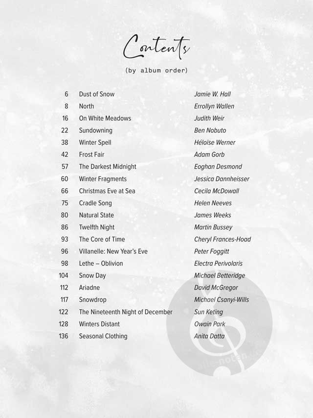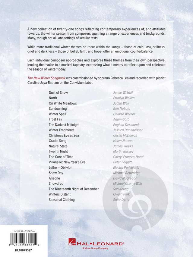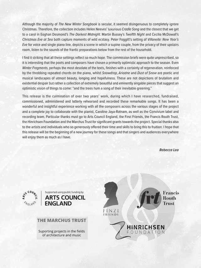 Eine neue Sammlung von einundzwanzig Kunstliedern, die zeitgenössische Erfahrungen und Einstellungen zur Wintersaison widerspiegeln, von Komponisten mit unterschiedlichen Erfahrungen und Hintergründen. Das Album "The New Winter Songbook" wurde von der Sopranistin Rebecca Lea in Auftrag gegeben und zusammen mit der Pianistin Caroline Jaya-Ratnam für das Label Convivum aufgenommen. Viele, wenn auch nicht alle, sind Vertonungen von weltlichen Texten. Zwar tauchen in den Liedern immer wieder traditionelle Winterthemen auf - Kälte, Verlust, Stille, Trauer und Dunkelheit -, doch bieten die Themen Glaube, Vertrauen und Hoffnung ein emotionales Gegengewicht. Jeder einzelne Komponist nähert sich diesen Themen aus seiner eigenen Perspektive und verleiht ihnen seine Stimme in einem musikalischen Wandteppich, der ausdrückt, was es bedeutet, über den Winter nachzudenken und ihn heute zu feiern.