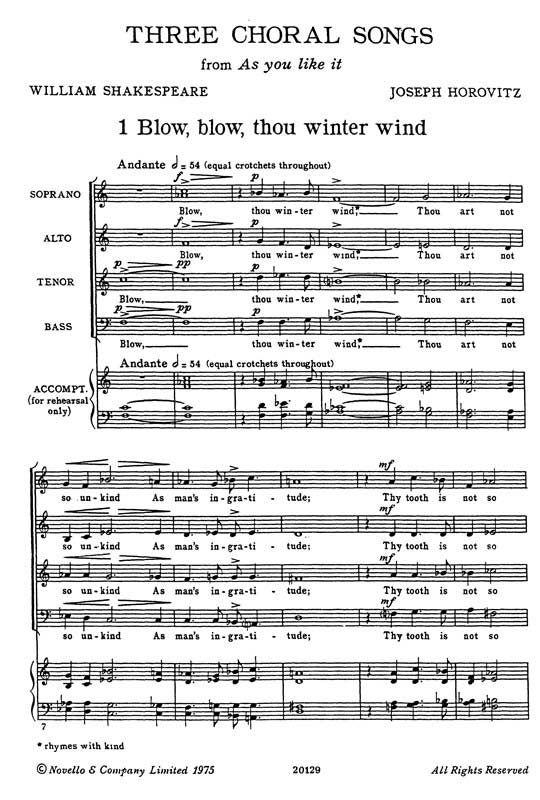 Three Choral Songs from William Shakespeare's As You Like It in a setting for SATB choir by Joseph Horovitz.