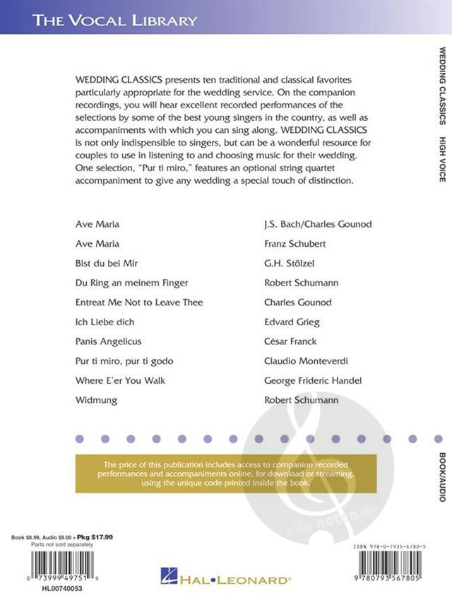 A collection of classical and traditional favorites for the wedding service, packaged with an excellent recording of full performances (featuring top quality young singers) as well as accompaniments only. Includes one duet with optional string quartet. Co