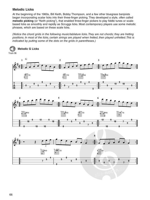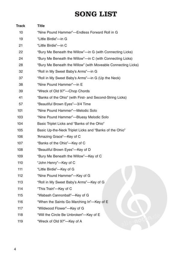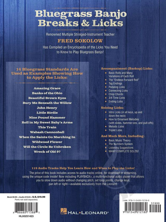 This encyclopedia of licks you need to know to play 5-string bluegrass banjo includes accompaniment (backup) licks, soloing licks, as well as basic music theory, the Numbers system, listening suggestions, and many complete solos, plus 119 audio tracks available online for download or streaming to help you learn how and when to play the licks. 14 bluegrass standards are used as examples showing how to apply the licks: Amazing Grace - Bury Me Beneath the Willow - John Henry - Little Birdie - Nine Pound Hammer - Roll in My Sweet Baby's Arms - This Train - Wabash Cannonball - When the Saints Go Marching In - Will the Circle Be Unbroken - and more. Audio is accessed online using theunique code inside the book and can be streamed or downloaded. The audio files include PLAYBACK+, a multi-functional audio player that allows you to slow down audio without changing pitch, set loop points, change keys, and pan left or right.