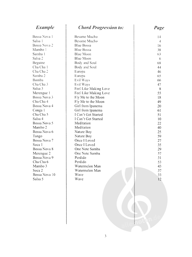 The Latin Bass Play-a-Long is designed to help bass players and also keyboard players to improve their bass playing technique in various Latin styles including, Salsa, Mambo, Bossa Nova, Merengue, Soca, Tango, Conga, Cha Cha, Bomba & Beguine. Each chord progression (based on popular Latin/Jazz tunes such as: Wave, Watermelon Man, I Can't Get Started, Perdido, Besame Mucho, Nature Boy, Blue Moon, Feel Like Making Love, Girl From Ipanema, Fly Me to the Moon, Meditation, One Note Samba, Blue Bossa, Europa, Body & Soul, Evil Ways, Fly Me to the Moon,) is played in two different Latin styles so the player can compare and contrast each style giving a total of 34 examples. For instance the chord progression to 'Nature Boy' is played in the first example as a Bossa Nova and the second example as a Tango. Each of the 34 examples has been recorded three times with the first time being played at a normal tempo with piano, bass & drums so that the musician can hear the finished performance. The bass is prominent in the playback of the mix. The second time, the example is played at a normal tempo with piano and drums but no bass so that the musician can practice along with the rhythm tracks. The third time has the example slowed down by 30-40 beats per minute with the piano and drums being heard through both stereo speakers and the bass being heard just through one speaker. This enables the musician to not only be able to listen to the bass line at a slower tempo by moving the balance control of your stereo system but also to play a long with the piano and drums by moving the balance control of your stereo system the other way.