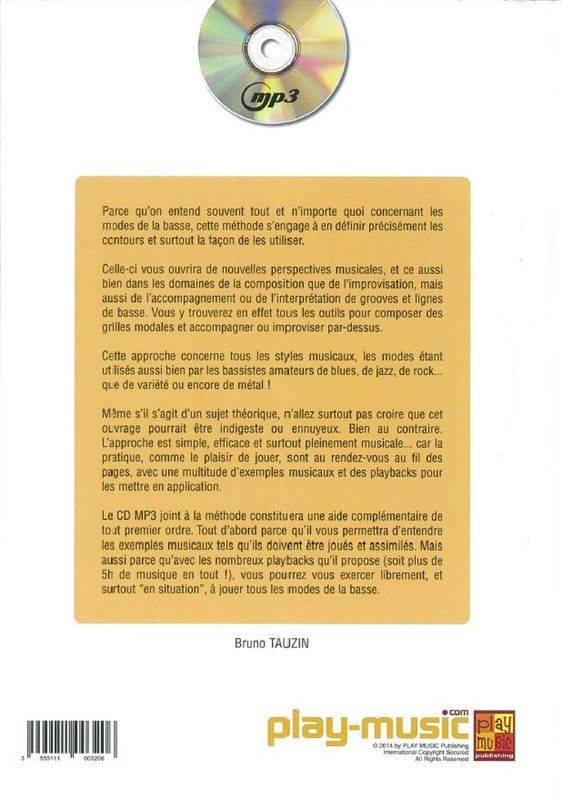 As a bassist you have probably heard of modes, but might be unsure about how to use them to their best advantage. This method aims to clarify things by teaching you how to play modes and explaining how they can be applied. This book will help you to explore the new musical options that modes can offer - not only for composing or improvising, but also for accompaniment or performance of Bass grooves or lines. You will find the tools you would need to compose modal progressions, accompany or improvise. This approach could be applied to any musical style, such as blues, jazz, rock...pop or metal. Even if the subject is theoretical, do not expect this book to be boring or indigestible. The approach is simple, effective and musical... because practice and the pleasure of playing are the main themes of this book and many musical examples are featured. The included MP3 CD will be helpful, first of all to listen to the examples as they should be played but also because of the numerous playbacks (more the 5 hours of music).
