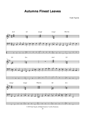 This book contains ten walking bass lines to ten of the most common chord progressions from jazz standards. These walking bass lines will give you a good basis for what to play and how to outline the chords to provide a good solid walking bass line for soloists to improvise over. I strongly suggest that you memorize these bass lines and try to substitue different notes here and there to alter the tonal colors. Also, play the given arpeggios to better hear the chord you are playing while being aware of the interval you are playing. Practice these slowly and with chordal accompaniment.