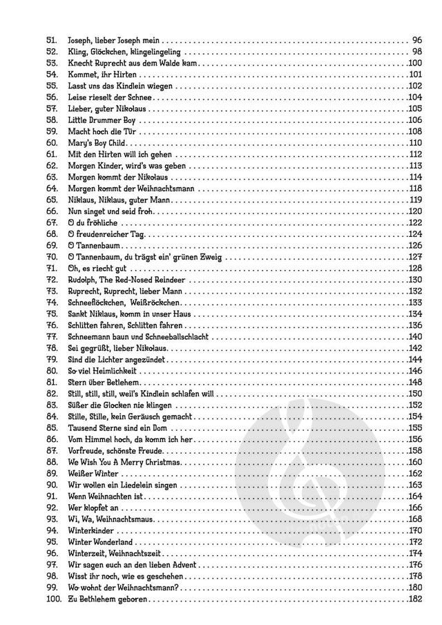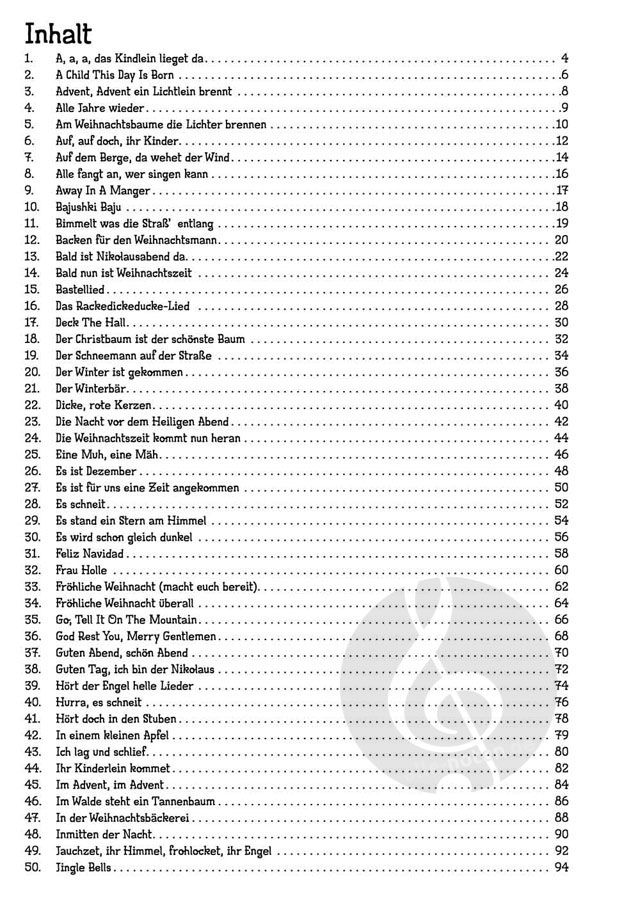 Traditionelle Weihnachtslieder für die ganze Familie, Weihnachtsklassiker von Rolf Zuckowski, Detlev Jöcker oder Frederic Vahle sind ebenso vertreten wie Popsongs wie Mary's Boy Child von Boney M. oder Hurra, es schneit von Nena. Auch mit dabei sind viele beliebte Lieder aus der ehemaligen DDR, wie z. B. Oh, es riecht gut, Vorfreude, schönste Freude oder Tausend Sterne sind ein Dom. Die Sammlung eignet sich wunderbar für den Kindergarten, die Grundschule oder für das gemeinsame Singen und Musizieren zu Hause.