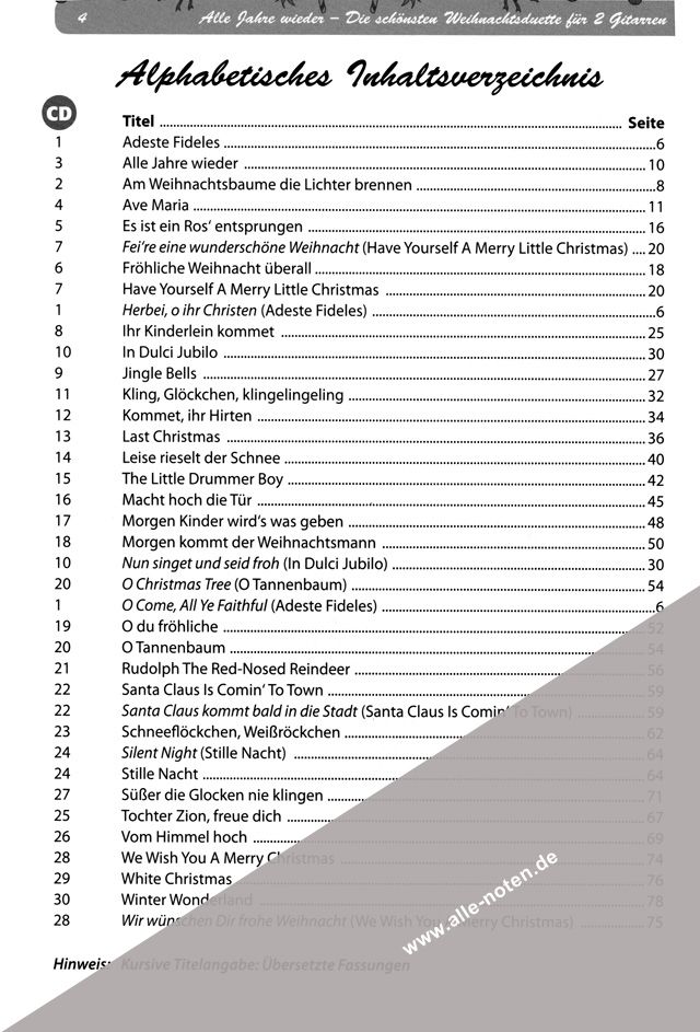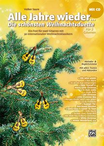 Alle Jahre wieder erstürmen Weihnachtslieder wie White Christmas oder Last Christmas zur Weihnachtszeit die Single Charts. Alle Jahre wieder - Die schönsten Weihnachtsduette für Gitarre bietet insgesamt dreissig Duo-Arrangements dieser beliebten und bekannten, deutschen und internationalen Weihnachtsklassiker für zwei Gitarren. Laden Sie sich einen Gitarrenpartner zu Weihnachten ein, spielen Sie zusammen mit Ihrem Kind, musizieren Sie zusammen mit Ihrem Lehrer im Gitarrenunterricht, organisieren Sie Ihr eigenes weihnachtlich-konzertantes Vorspiel. Dieses Buch bietet Ihnen viele Optionen! Ihnen fehlt der geeignete Gitarrenpartner? Kein Problem: Einfach eine Stimme auf der beiliegenden CD ausblenden und mitspielen!