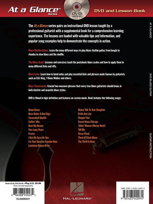 A first of its kind, the At a Glance series pairs an instructional DVD lesson taught by a professional guitarist with a supplemental book for a comprehensive learning experience. Each book/DVD features several lessons pertaining to one topic, and the DVD lessons feature on-screen music. The lessons are loaded with valuable tips and information, and song examples help to demonstrate the concepts in action. Blues Guitar - At a Glance features four lessons: Blues Rhythm Guitar, The Blues Scale, Blues Licks, Blues Turnarounds.