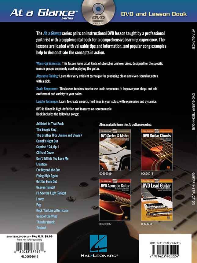 A first of its kind, the At a Glance series pairs an instructional DVD lesson taught by a professional guitarist with a supplemental book for a comprehensive learning experience. Each book/DVD features several lessons pertaining to one topic, and the DVD lessons feature on-screen music. The lessons are loaded with valuable tips and information, and song examples help to demonstrate the concepts in action. Guitar Technique - At a Glance features four lessons: Warm-Up Exercises, Alternate Picking, Scale Sequences, and Legato Technique.