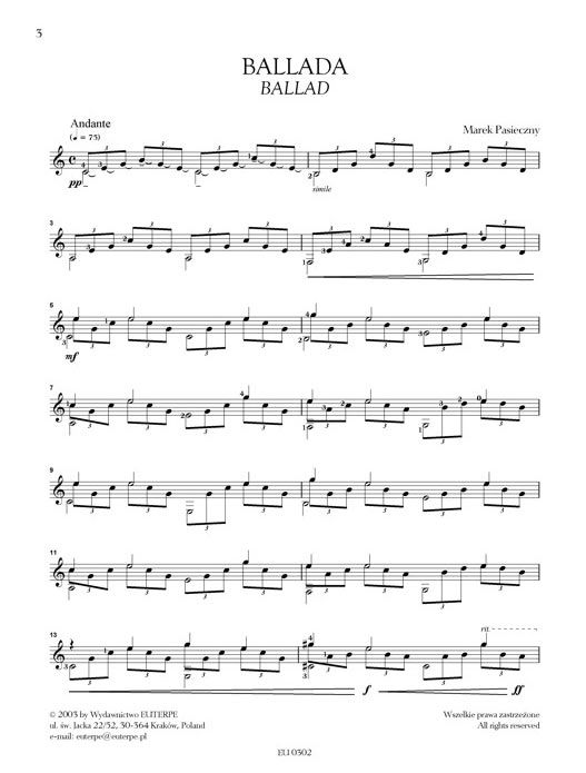 Es wurde auch darauf geachtet, den Interpreten auf jede Komposition und die damit verbundenen Herausforderungen vorzubereiten. Dazu werden vor jeder Etüde kurze Übungen eingefügt: eine Zusammenstellung von Fingersätzen für die linke Hand, verschiedene Griffschemata für die rechte Hand sowie Übungen zur Entwicklung der richtigen (d. h. alternativen) Fingersatztechnik. Das Spiel mit dem alternierenden Fingersatz (i-m) sowie der ergänzende Einsatz des a-Fingers gehört zu den schwierigsten technischen Elementen; Wenn der Spieler auf 'atypische' Elemente trifft (z. B. Legato, Positionswechsel, komplizierte Rhythmen), neigt die rechte Hand dazu, 'automatisch' das Spiel mit der richtigen Fingersatztechnik aufzugeben. Bevor Sie versuchen, an den Etüden zu arbeiten, wird empfohlen, an der präzisen Ausführung der Übungen auf offenen Saiten zu arbeiten.