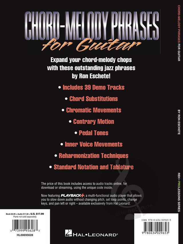 Expand your chord-melody chops with these outstanding jazz phrases by Ron Eschete! He covers: chord substitutions, chromatic movements, contrary motion, pedal tones, inner-voice movements, reharmonization techniques, and much more. The book includes standard notation and tablature, and the CD features 39 helpful demo tracks.